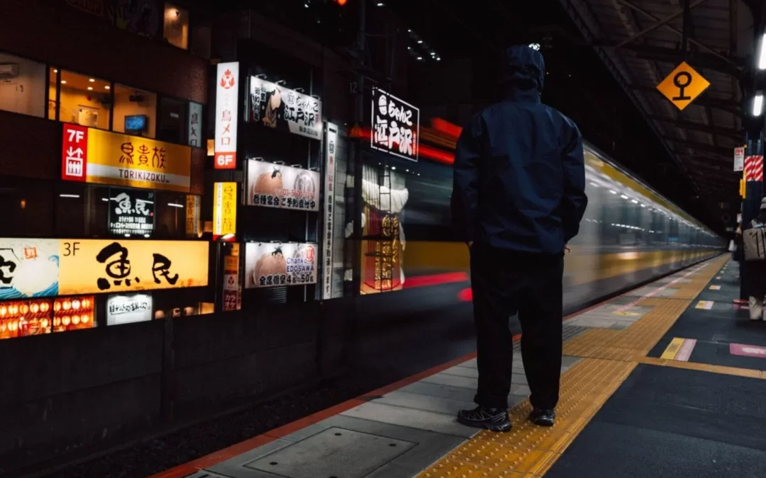 Mann mit Kapuze steht bei einer U-Bahnhaltestelle. Man sieht viele grelle Leuchtreklamen.